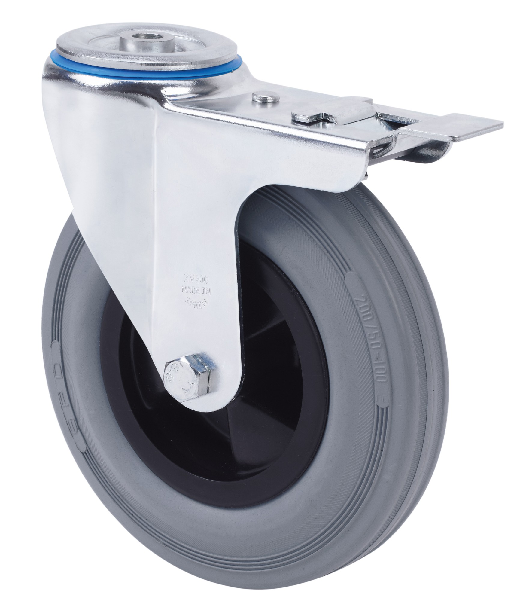 ALEX – RUEDA GIRATORIA.AGUJERO M12 FRENO 20ZVFD200CP-PSB POLIAMIX-GOMA GRIS EJE BOLAS