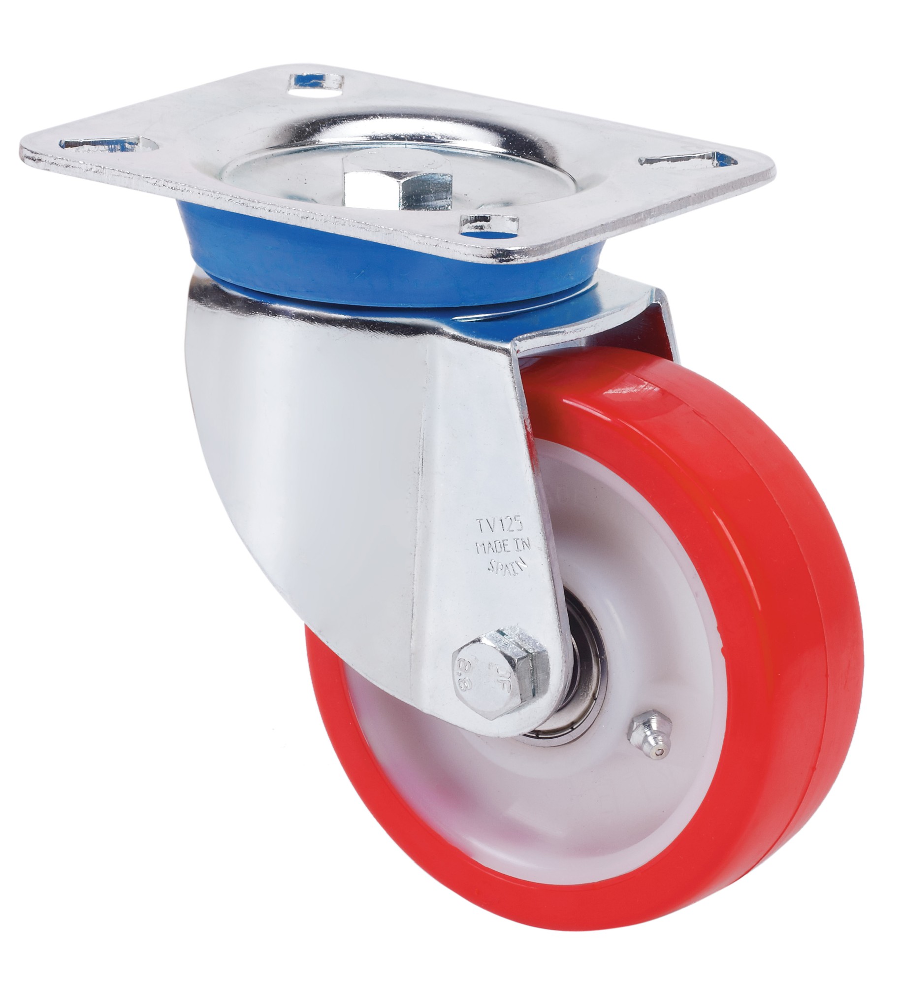 ALEX – RUEDA GIRATORIA.PLACA 10TV100-POB NYLON BLANCO-POLIUR.ROJO EJE BOLAS