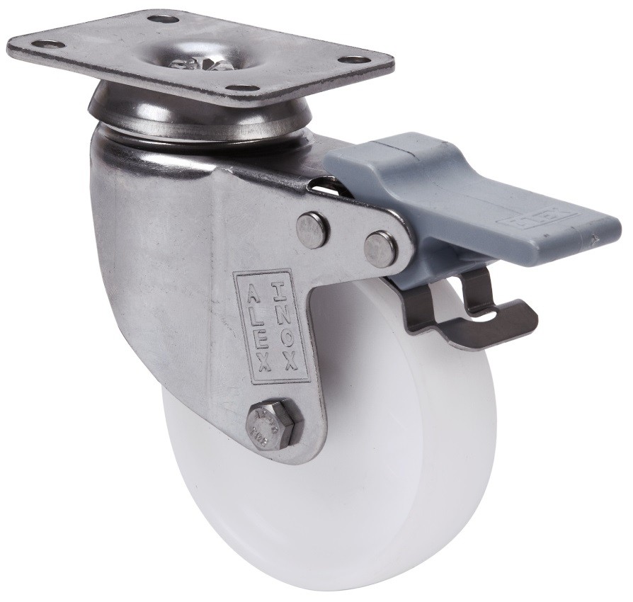 ALEX – RUEDA GIRATORIA.PLACA FRENO INOX.10BHIFD60-BP PLASTICO BLANCO EJE LISO