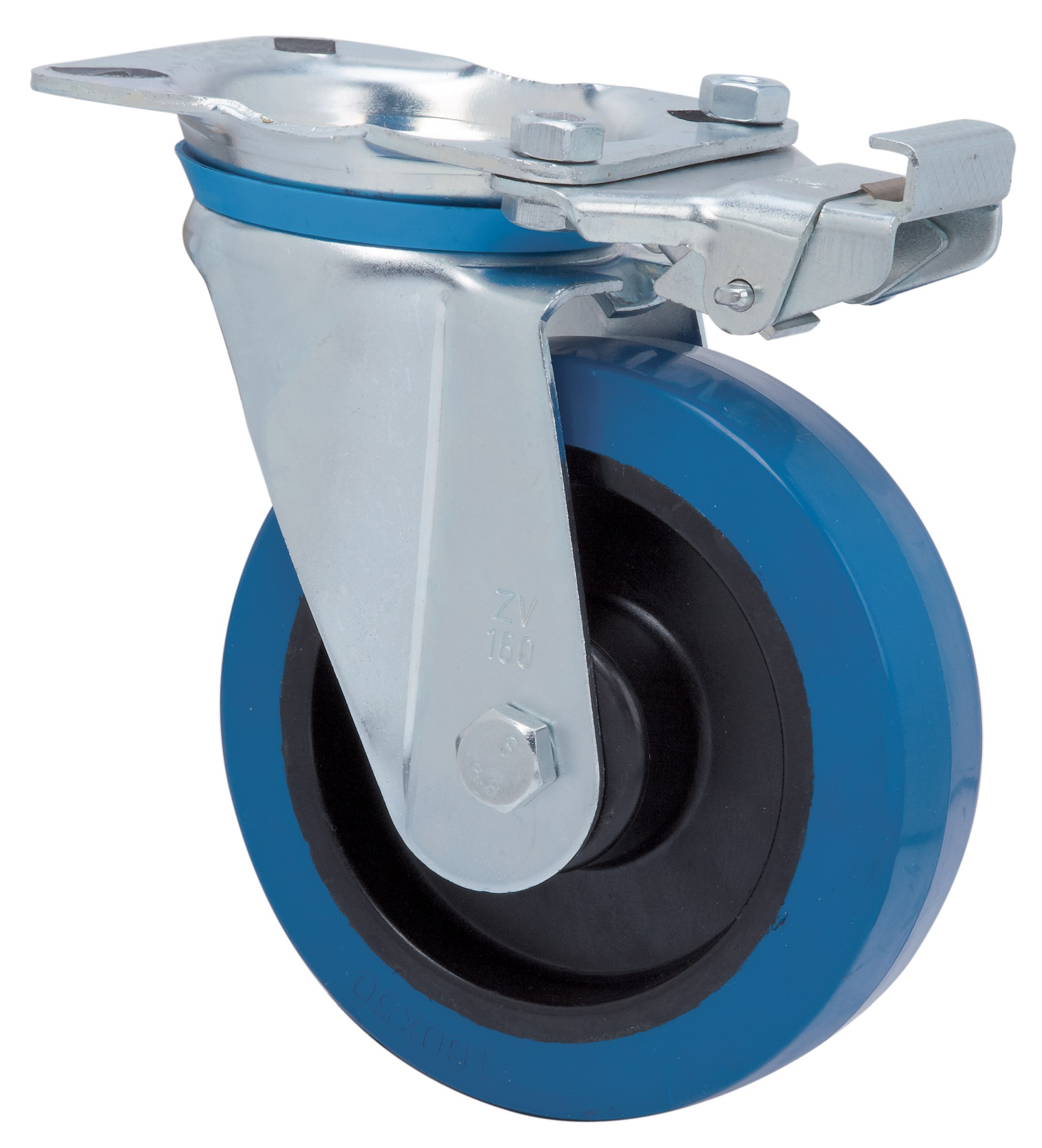 ALEX – RUEDA GIRATORIA.PLACA MEC.DIR.10ZVMD160-PGMR POLIAMIX-GOMA AZUL EJE RODILLOS