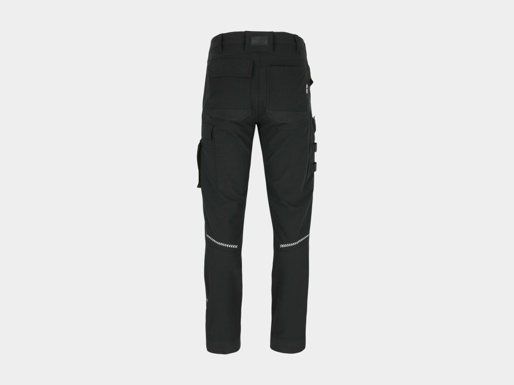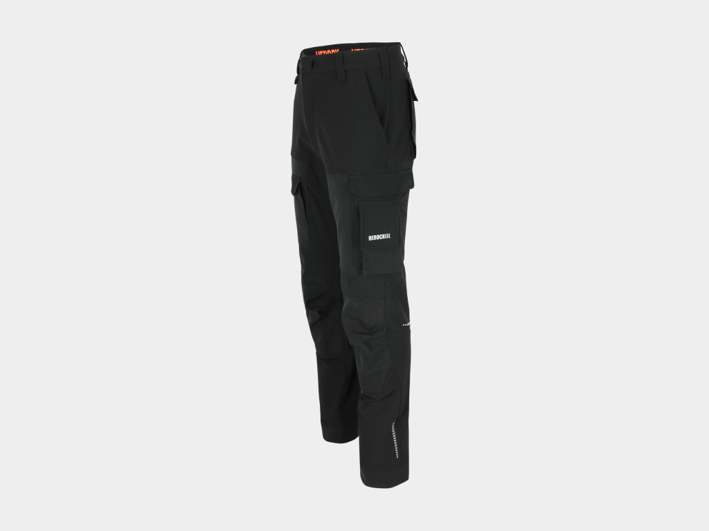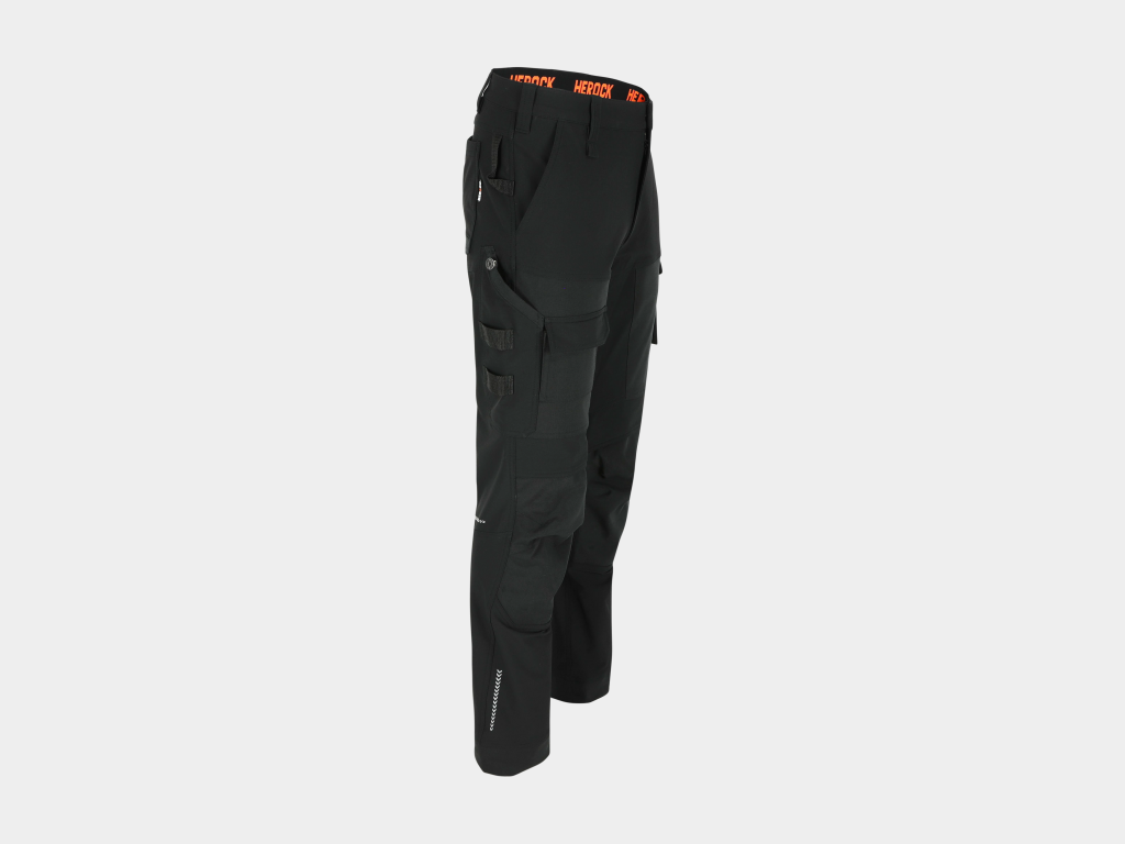 Herock – PANTALÓN FARO – 48 NEGRO 92% poliamida reciclada – 8% elastano 260 g/m² Refuerzo: 51,4% poliéster Cordura® – 48,6% poliéster Sorona® 326 g/m² repelente al agua