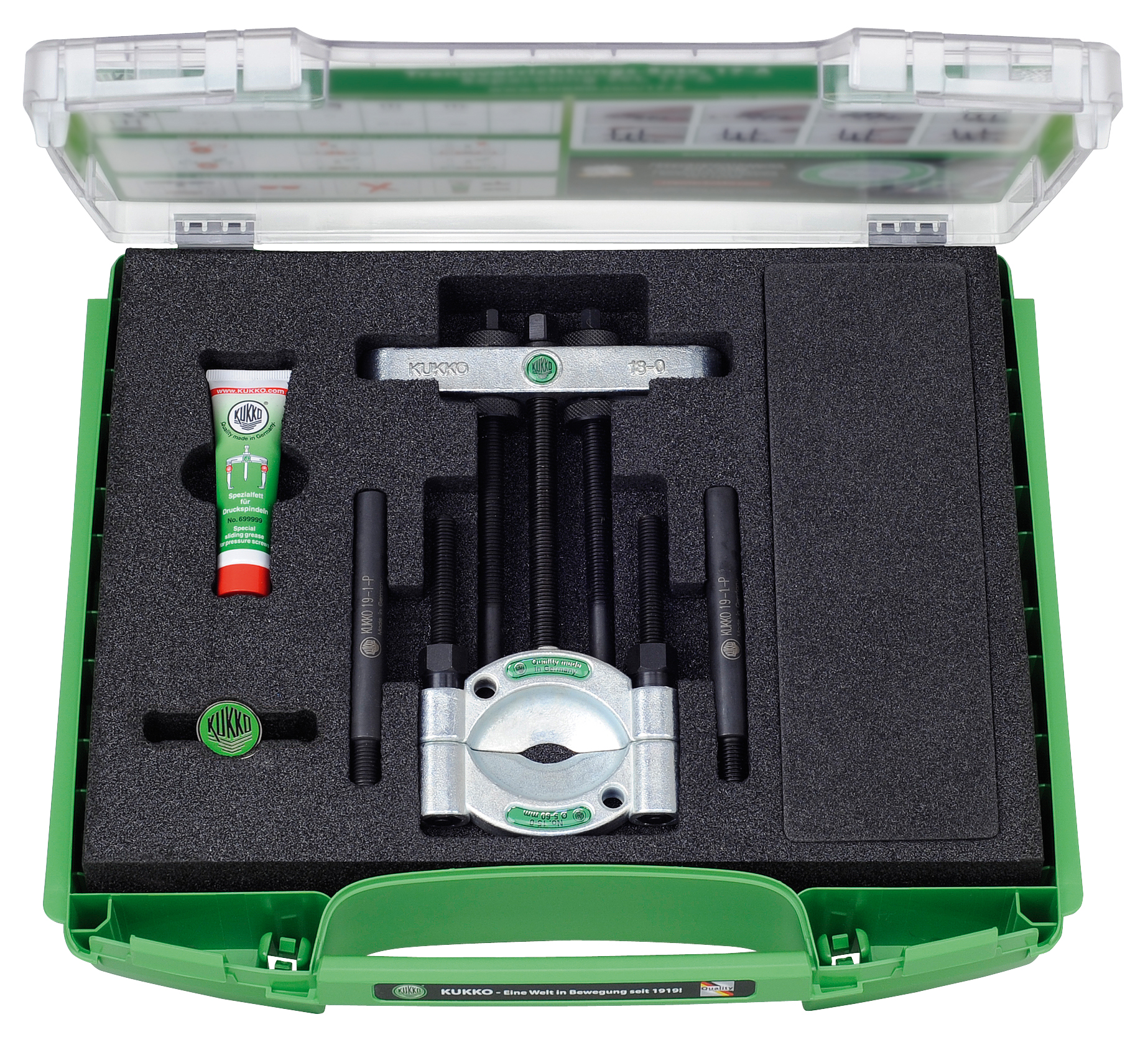 Bien ordenado y protegido gracias al sistema KUKKO-i-Boxx. Almacenamiento seguro en espuma especial.