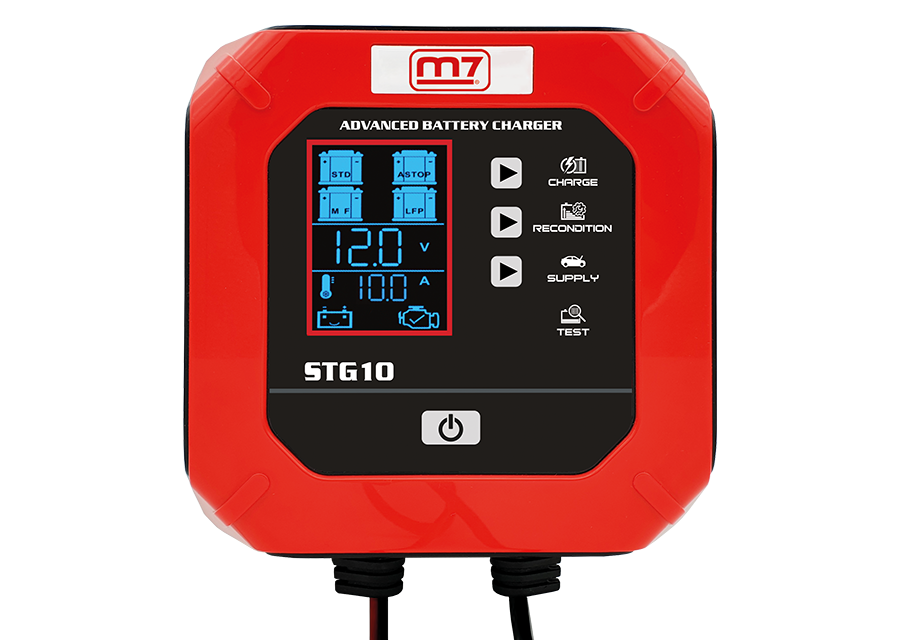 El M7-STG10 es un cargador automático de baterías 12 V pensado para vehículos y maquinaria. Permite carga, mantenimiento y diagnóstico de baterías de plomo-ácido (AGM, WET, EFB, VRLA) y baterías de litio LiFePO4. Está diseñado para recuperar, mantener y prolongar la vida útil de baterías, incluso cuando el vehículo o maquinaria permanece parado por largos periodos.